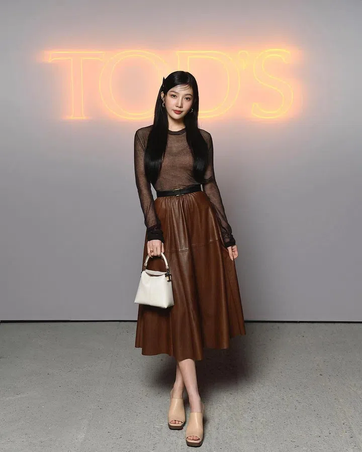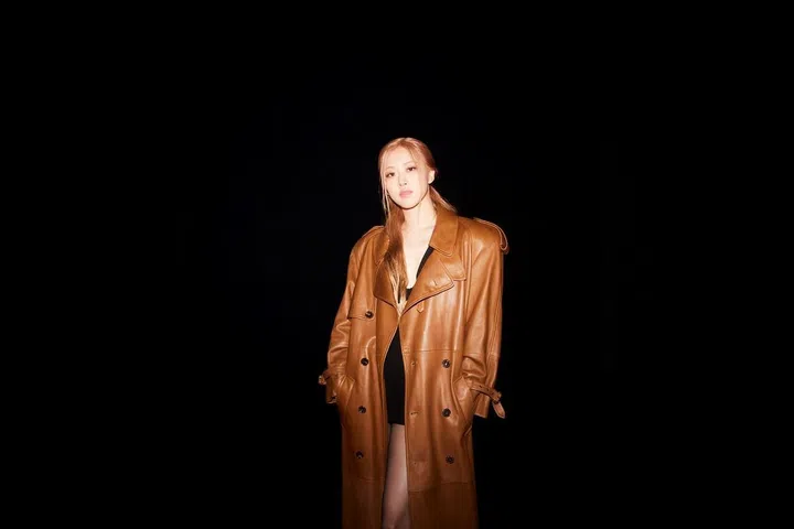 Saint Laurent品牌大使Rose穿着宽肩的长版皮革大衣,搭配黑色短裙和丝袜现身,展现”人间YSL”魅力。