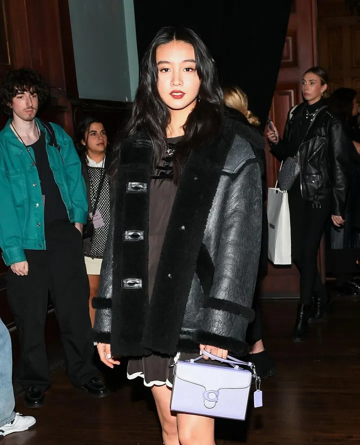 日本模特木村光希穿着黑色羊毛皮外套内搭滚边洋装,搭配膝下皮靴及薰衣草紫小包,焕发多元风格张力。