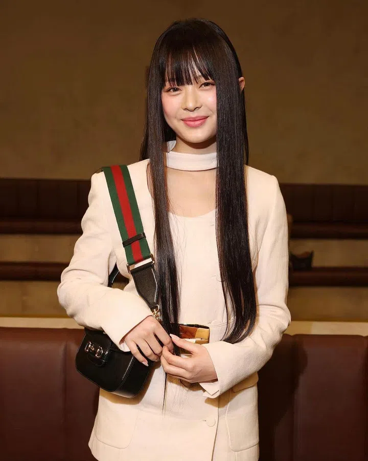Gucci最新代言人、组合NewJeans成员Hanni以一身米色套装搭配黑色Gucci 马衔扣1955系列手袋,诠释复古优雅格调。