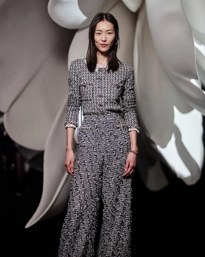 品牌代言人刘亦菲身穿Louis Vuitton 2023春夏系列造型,现身巴黎秀场,欣赏品牌女装艺术总监 Nicolas Ghesquière 的时装新作。
