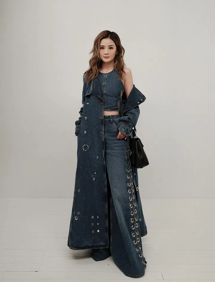 蔡卓妍穿着一件 Chloe 2023春夏系列风衣,搭配复古水洗再生棉麻上衣和裤子,手提Penelope包袋,挥洒潇洒光芒。