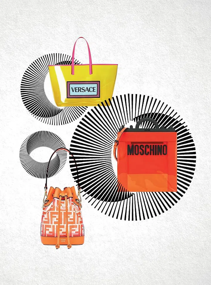 去年春夏,突然刮起了一股PVC热潮,像是Chanel秀场以PVC元素贯穿全系列,而Celine塑料手提袋更是火遍时尚圈。时隔一年,该元素依然热度不减,从Chanel、Versace、Fendi再到Moschino,将透明色绚丽彩色的PVC,运用到包款设计上,成为时尚未来元素,给人一种非常透亮和清新的感觉。设计方面不仅限于简约风格,反而是巧妙运用透明塑料配合不同材质,彰显了现代流行的混搭简约风范,色彩的应用大胆也让包包呈现出立体的廓形。由于PVC包包有着较强的视觉张力,势必成为造型的点睛之笔。