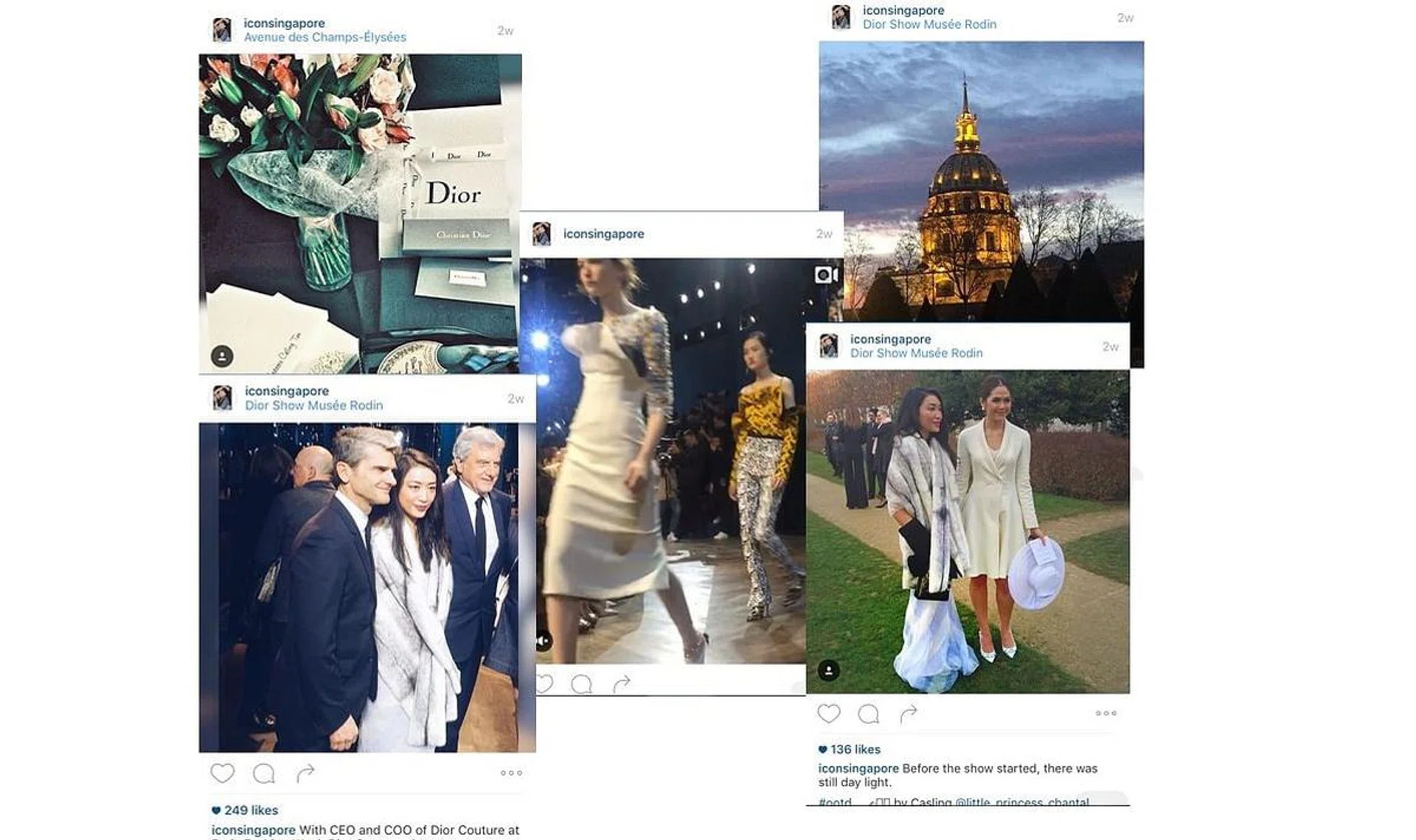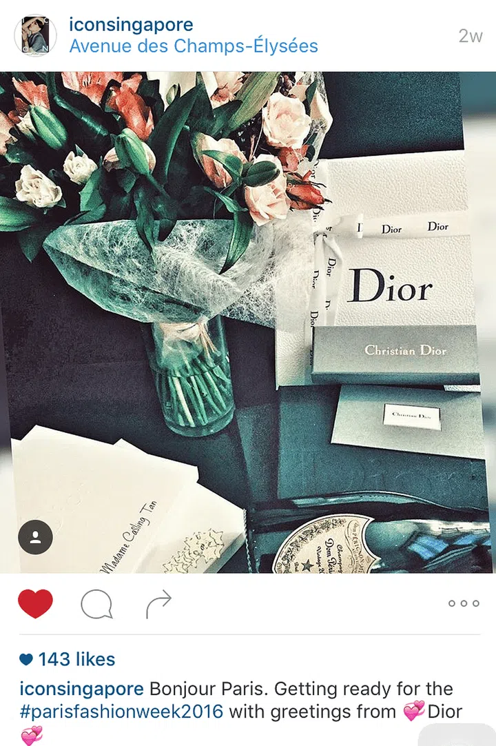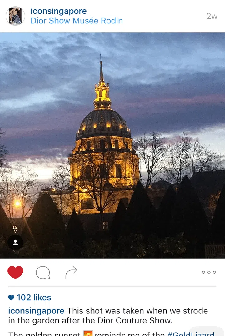 "This shot was taken when we strode in the garden after Dior Couture show. The golden sunset reminds me of the #goldlizard #Diorama on my latest IT bag list, I was carrying it during my photoshoot couple days ago. I am carrying the #silverlizard diorama at the Dior Homme show when fashion TV interviewed me."