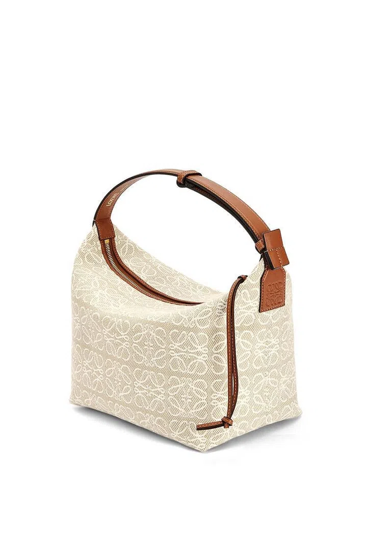 Loewe今年春夏推出的新包款Cubi,以牛皮革制作底座,包身则是燕麦色的刺绣帆布面料,经典的Anagram印花铺展其上,休闲不失奢雅。其皮革肩带可自行调节出适合自己的长度,作为肩包或腋下包使用。
