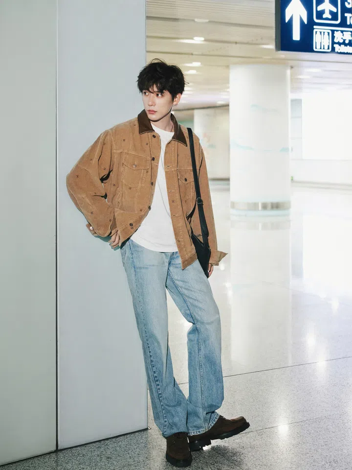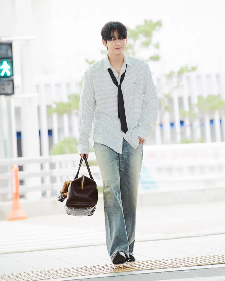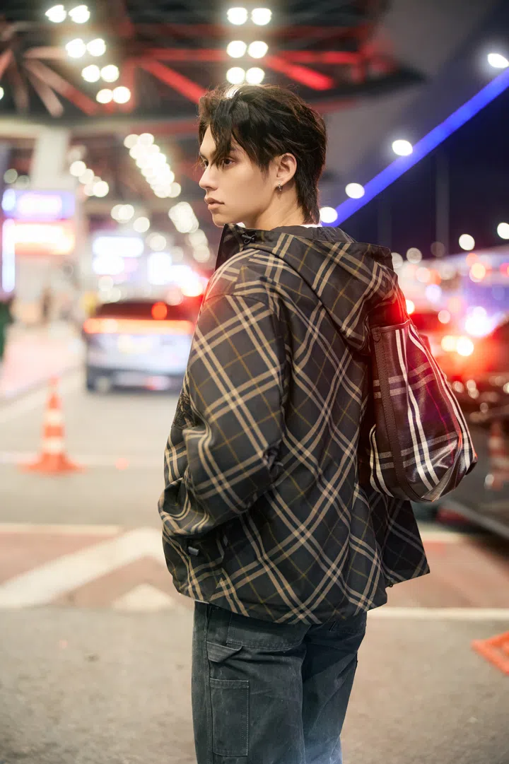 泰国品牌大使Bright Vachirawit以Burberry格纹夹克搭配简约白T与牛仔裤,手铃托特包,展现轻松随性的旅行风。
