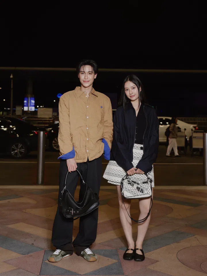 新任创意总监Jack McCollough与Lazaro Hernandez的Loewe首秀即将在2026春夏巴黎时装周登场。泰国明星Milk Pansa和Junior Panachai从曼谷启程飞往巴黎。Milk以衬衫叠搭马甲,搭配饰有流苏与皮革腰带细节的羊毛半裙,拎着Loewe x Albers系列Puzzle Bag;Junior则以衬衫配翻折牛仔裤,肩背Puzzle Biker Bag,率性演绎当代时尚格调。