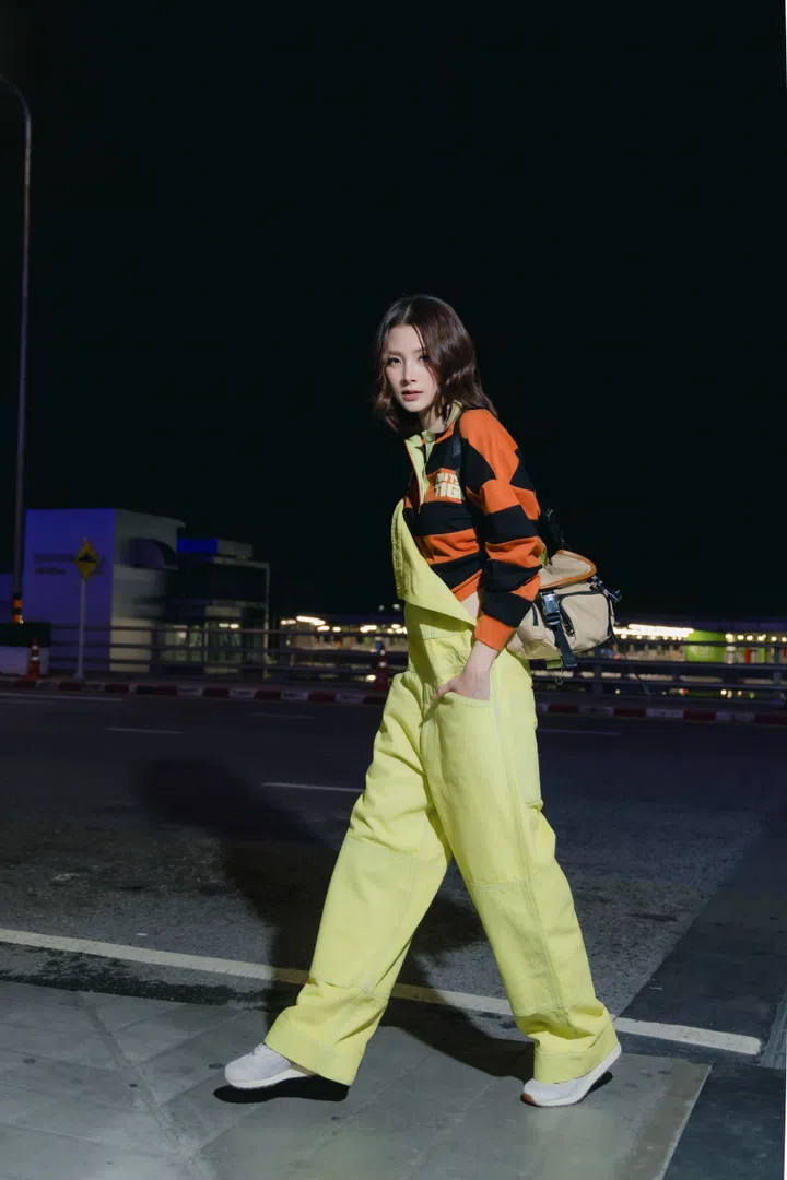 Baifern身穿Onitsuka Tiger WS Polo上衣叠搭荧光黄WS 牛仔背带裤出镜,搭配TIGER ALLY STITCH球鞋与单肩包,活力满分。