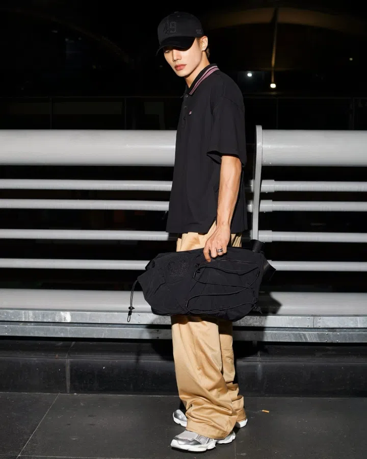Hael Husaini选择Onitsuka Tiger黑色宽松Polo衬衫、棒球帽与包邮差包,下身则以米色宽裤和TIGRUNTM鞋款搭配,酷感随性。