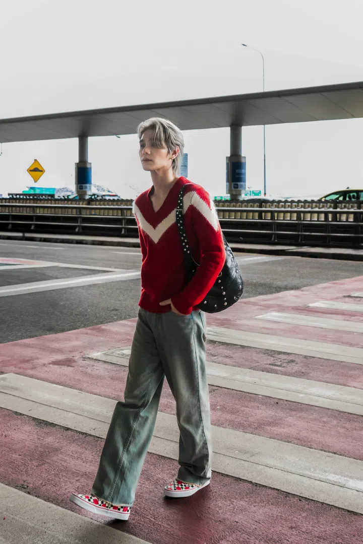 品牌大使Jeff Satur身穿Valentino 25/26秋冬 “Le Méta-Théâtre Des Intimités” 系列造型,搭配Valentino Garavani Hoboho手袋和Vans鞋履,出发前往巴黎出席Valentino 2026春夏“Fireflies”系列发布会。