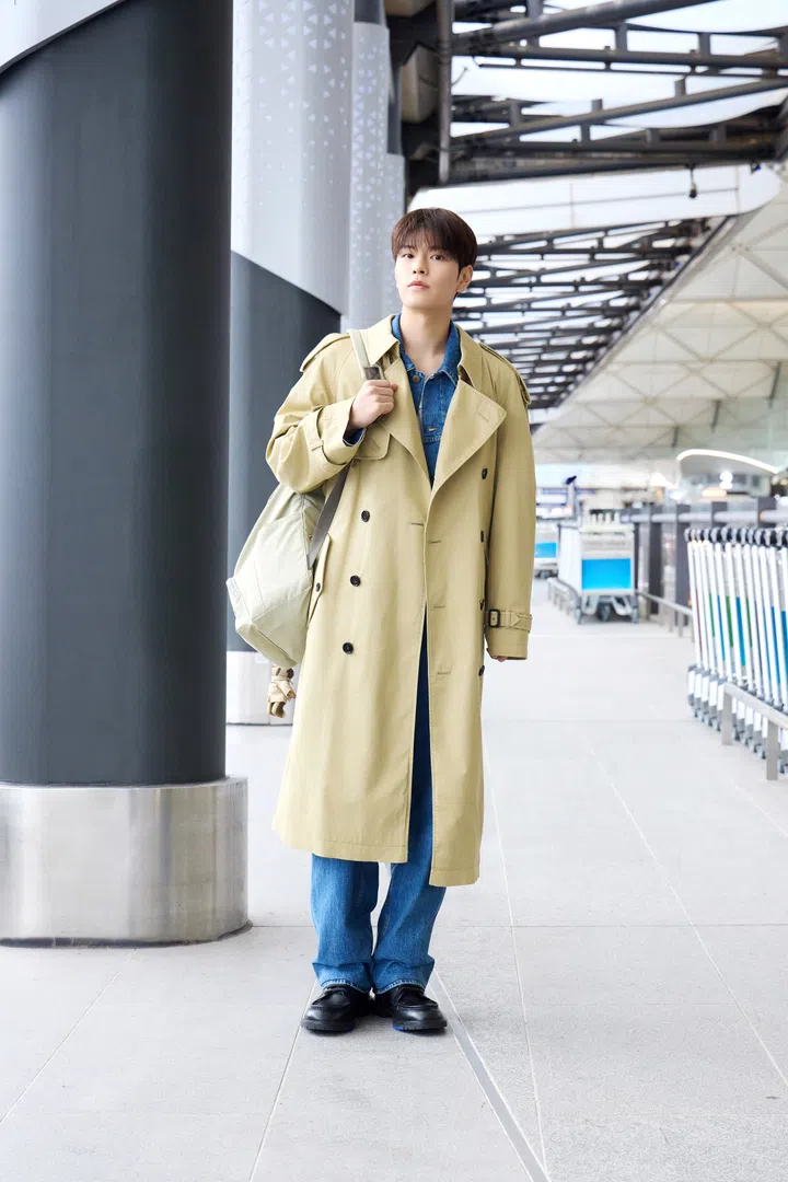 品牌代言人Seungmin身穿Burberry浅卡其色长风衣叠穿牛仔套装,随性背上大包,演绎清新休闲风格。
