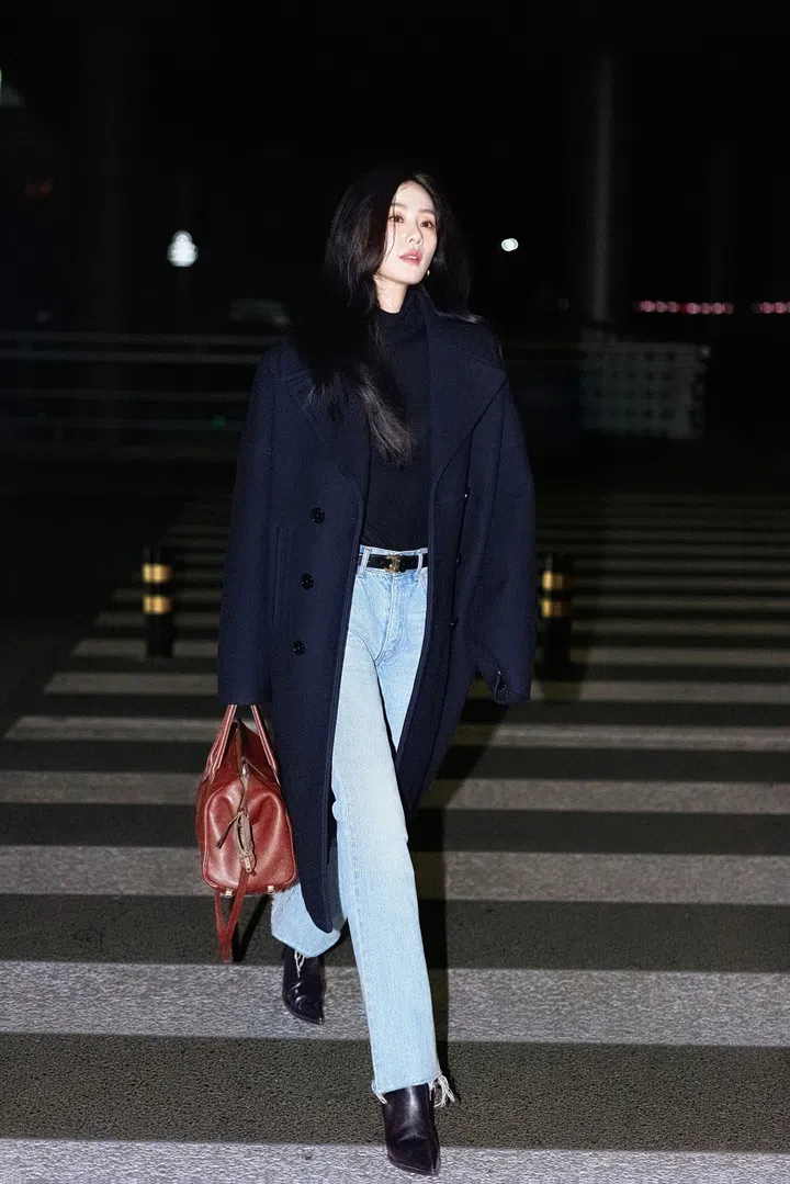 Celine品牌大使刘诗诗身穿羊毛针织高领上衣与同材质长款呢料双排扣大衣,搭配Dylan喇叭牛仔裤,脚踩饰有Triomphe标志的亮面小牛皮Celine Verneuil 踝靴,配以金色饰面黄铜Formes Abstraites方形耳环与Triomphe 15墨镜。她手拎中号New Luggage手袋,并以可翻转皮带及Triomphe搭扣点缀细节,整体造型优雅利落。