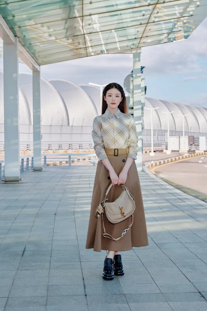 I-DLE成员舒华以Burberry格纹衬衫搭配高腰伞裙,配以米色手袋,尽显甜美优雅的少女气息。