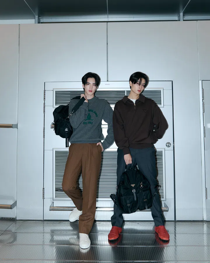 泰国男团BUS成员Phutatchai和Khunpol择简约针织衫与休闲裤装组合,搭配黑色尼龙背包亮相机场,整体造型干净利落。