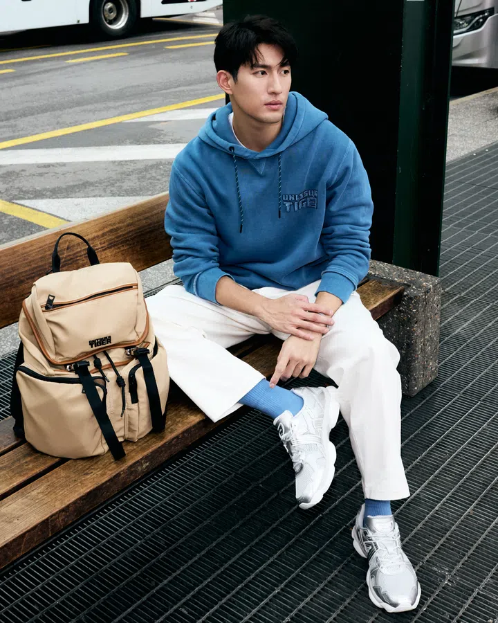 孙政身穿Onitsuka Tiger DENIVITA套头衫搭配白色裤装与TIGRUNTM运动鞋,再配以休闲背包,率性中透出简约活力。