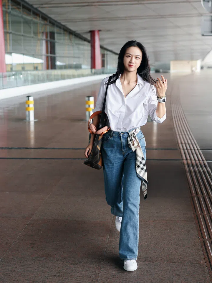 品牌代言人汤唯以白衬衫与牛仔裤的经典组合,标志性格纹细节点亮休闲造型,洒脱不失格调。