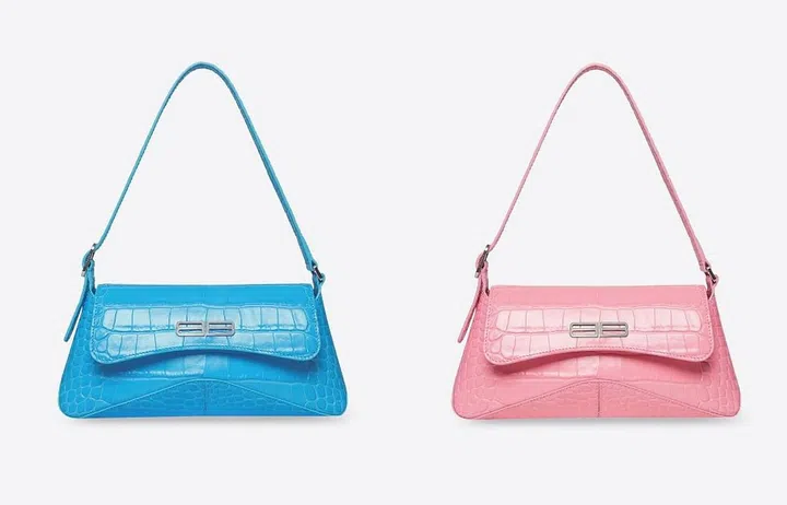 Balenciaga 2022春夏系列推出XX翻盖包,采用梯形包身搭配弧形包盖,共小号、中号和加大号三个尺寸,并可实现手提、肩背、斜挎等不同背法。颜色与材质方面,品牌以最具代表性的鳄鱼纹压花小牛皮为主打,也有基础版光滑小牛皮款式,提供棉花糖粉、天蓝、祖母绿、鹅黄和黑、白等丰富色彩选择。这款手袋富有建筑感,百搭的设计适合休闲出街时携带。