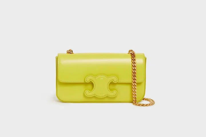 Celine的Cuir Triomphe凯旋徽标贴饰系列手袋依然是2022春夏的主打单品之一,修长的链条包廓形颇具人气,放大的Logo压花皮革贴片以刺绣工艺缝合在包扣处,搭配和包身同色小牛皮,除了有经典的黑、白和老花款式,这款阳光黄色最引人注目。