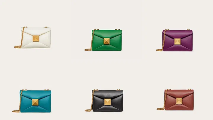 铆钉一直是Valentino标志性的元素,在品牌的2022春夏系列中,推出全新One Stud铆钉包,采用小巧复古的信封轮廓,最夺人眼球的是中央镶嵌一颗超大号金字塔形铆钉,简约大方且不失品牌特色。包包由柔软的纳帕小羊皮制成,金字塔形铆钉采用仿旧金色饰面黄铜锻造,共有亮明亮黄、海洋蓝等等7种配色。