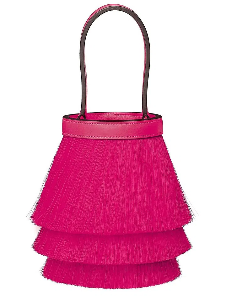 Hermes新一季作品采用明快的亮色系为基调,2022春夏系列中的Toupet手袋,设计灵感来自1920年代流行的直筒低腰连衣裙,造型活泼有趣。本季选用亮色马鬃搭配同色的Swift 小牛皮,是一款充满俏皮风格的晚宴包。