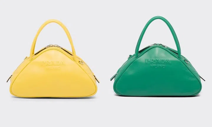 说起Prada标志性的符号,或许会想起品牌Logo的三角形图案。在2022春夏系列中,Prada将圆润复古的保龄球包和三角造型组合,呈现这组柔软小巧的三角包搭配织物宽肩带,打造阳光黄、芒果绿和纯白色版本,展现极简又具运动气息的美学风格。