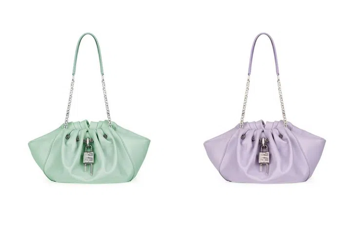 Givenchy 2022春夏全新Kenny手袋,以2000千禧年时代的复古晚宴包为灵感,打造出褶皱“裙摆”廓形,饰以硬朗的4G五金件与优雅包型形成冲突之美。手袋的名字源自Givenchy灵感缪斯、美国超模 Kendall Jenner,她曾在2021年Met Gala的After-party上拎着这款手袋出镜。Kenny手袋目前上架两个尺寸,小号采用极为柔软的牛犊皮制作而成, 迷你尺寸则采用具有光泽感的缎面材质打造,共有黑、白、薄荷绿和2022年年度流行色“长春花蓝”4种配色。