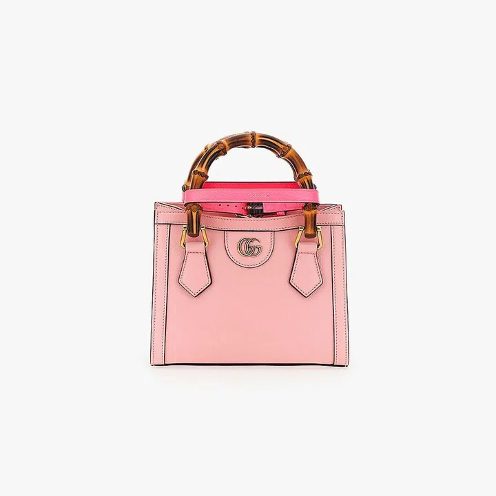 这款粉色Diana竹节包出自Gucci 2021秋冬系列,采用典藏竹节手柄搭配方正托特包型,推出迷你、小号和中号3个尺寸,手袋都配有一根可拆卸可调节皮革肩带,实现多种背法需求。