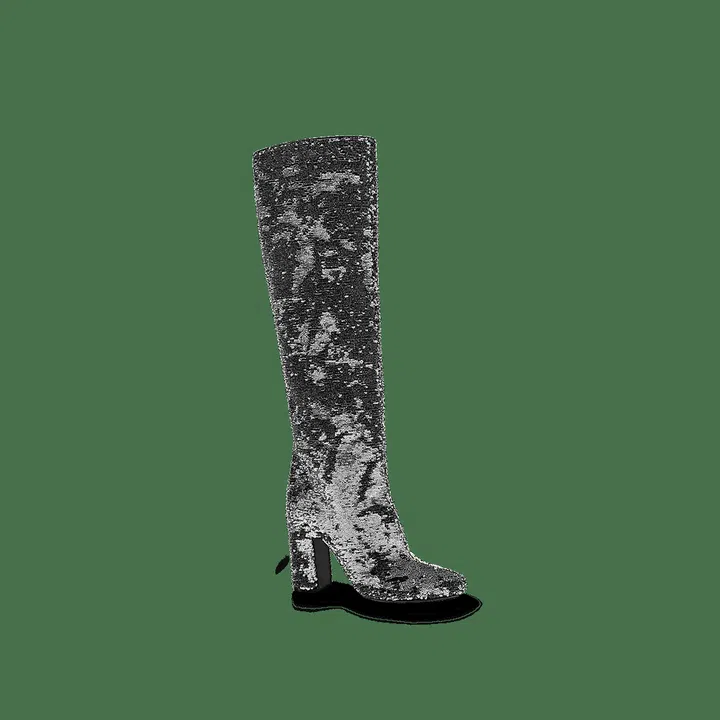 这双Louis Vuitton Donna高筒靴以。管状鞋型和稳固方根演绎1970年代风尚,配上Monogram帆布贴饰和迷你Monogram帆布饰边点缀鞋后。鞋子上的闪耀珠片绽放璀璨光芒,更呼应2023早春秀场的迪斯科主题。