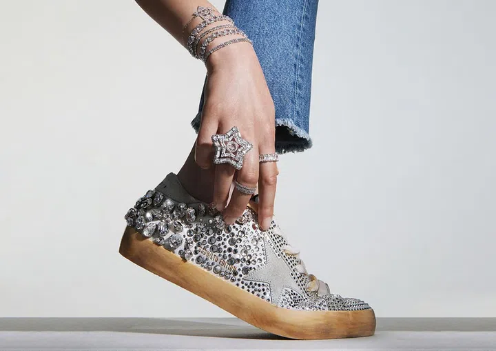 奢侈鞋服品牌Golden Goose携手施华洛世奇Creators Lab发布限量合作系列,包括两款饰有施华洛世奇仿水晶的经典Golden Goose Super-Star运动鞋新品,以及一款饰有仿水晶镶饰Golden Goose旗帜图案的独特滑板。这款白色皮革鞋款饰有麂皮星星、后帮和嵌片,满饰精美的透明仿水晶。各种形状和大小的手工镶嵌仿水晶,让鞋款更耀眼夺目,增添视觉魅力。