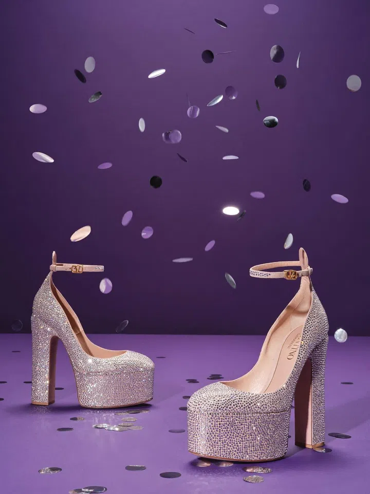 闪亮登场!Valentino Garavani的高跟鞋以柔软的绒面革布满了熠熠闪亮的水晶缀饰,超高鞋跟和防水台,不仅能为你轻松拔高身形,且不会给足弓带来过多压力,“Vlogo” 饰牌巧妙穿过纤细踝带,彰显品牌特色。