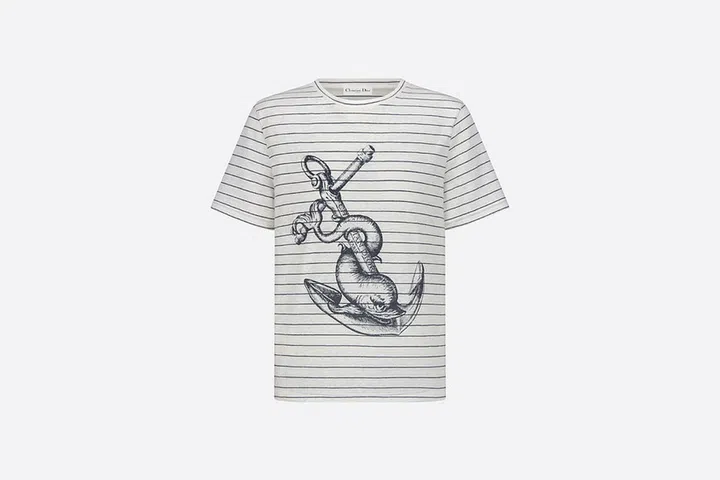 Dior的2022年早春系列取材自希腊悠久的历史与文化。这款T恤采用条纹印花,饰以锚形和海豚图案,通过这两个符号向该系列的希腊风情致敬。由米白色棉质和亚麻混纺平纹针织面料精心制作,经典的圆领剪裁搭配品牌标志,背面则绣有小蜜蜂标识,彰显优雅鲜明的格调。