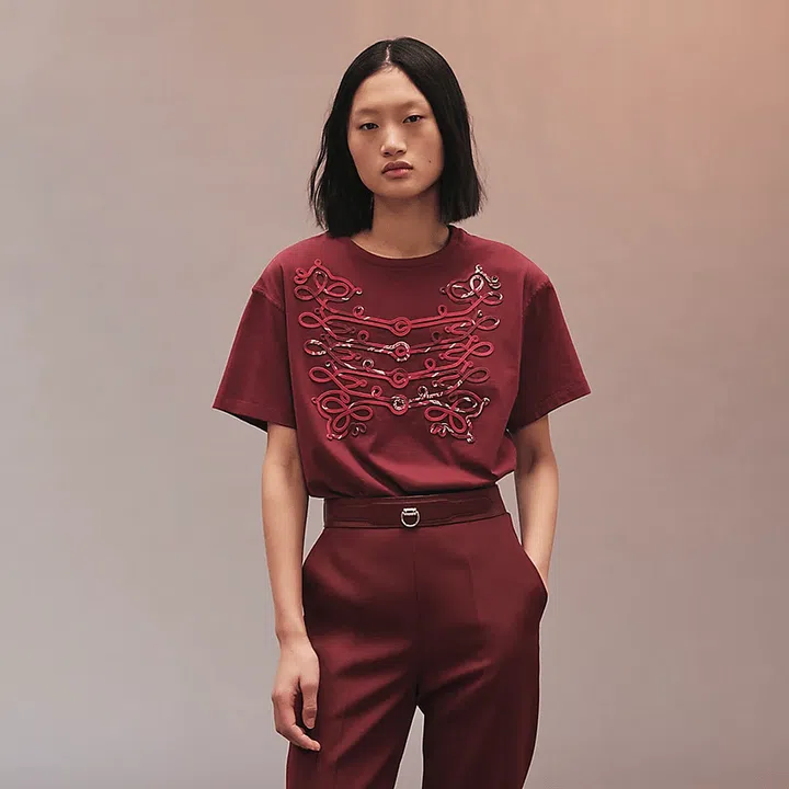 Hermes总能以低调简约的设计诠释品质奢华,这款全棉宽松T恤以以舒适的剪裁搭配质感丰厚的色彩,缀以"Brides de Gala" twilly 刺绣,将璞质与优雅完美展现。