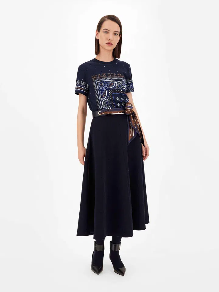别具一格的Max Mara棉质T恤,印有精美的佩斯利花纹和大写的品牌名称,利落的剪裁令衣身更显宽松闲适,不妨配上一条优雅的中长裙及丝巾皮带,呈现温婉大方的风格。