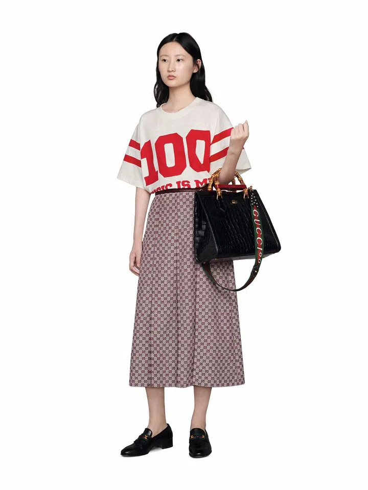 今年是Gucci的100岁生日,品牌创意总监Alessandro Michele以音乐为主题设计Gucci 100特别系列。他筛选出几首带有“Gucci”歌词的流行歌曲,并把歌词融入在服饰之中。这款T恤融入歌曲“The R”的歌词印花和象征品牌百年庆典的数字“100”,将音乐和Gucci美学交相辉映。