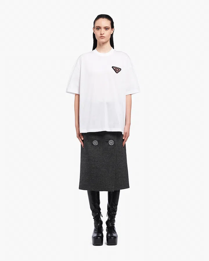 Prada T恤是品牌的基础性着装,承载着简约而华美的设计理念。这款宽松的平纹针织T恤饰以新颖的提花针织三角形徽标,复古的几何图案,赋予衣身概念化的元素,同时也呼应了2021秋冬时装秀展示的针织,让人一眼就能识别。