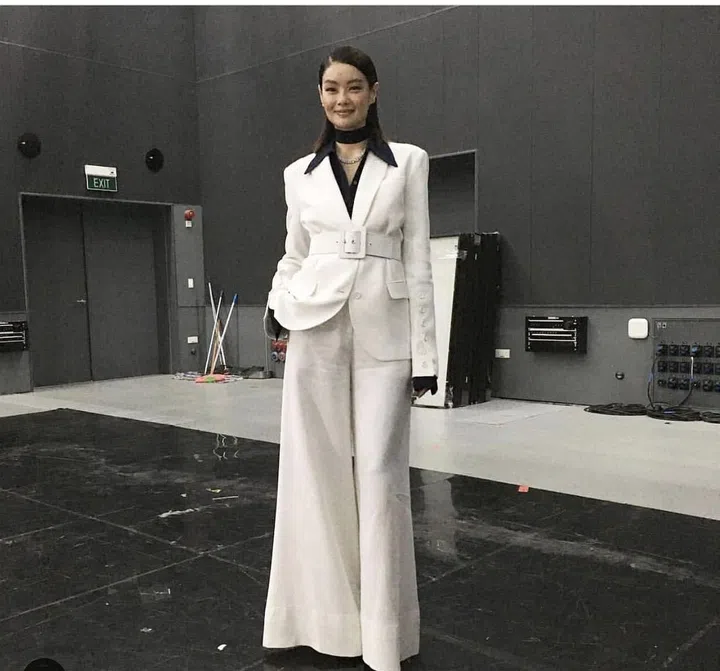 从模特转战影视的Sheila选择以中性的绅士造型亮相,Michael Kors白色西装外套搭配阔脚裤及oversized的白皮带,穿出完美的九头身比例,既帅气亦不失小性感。