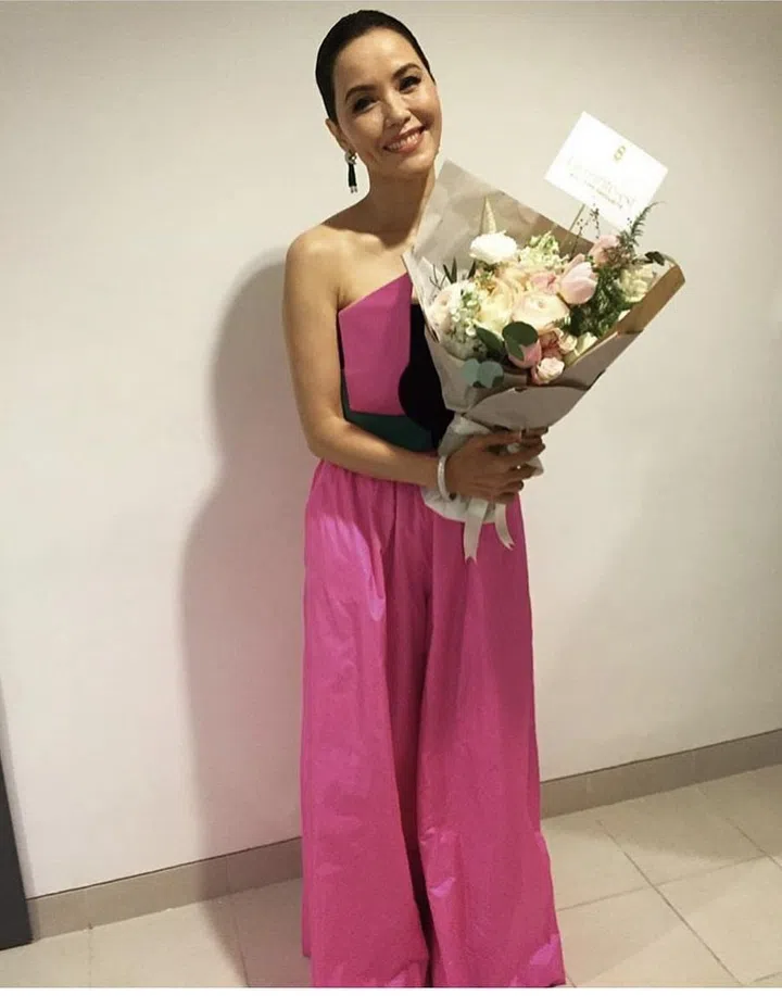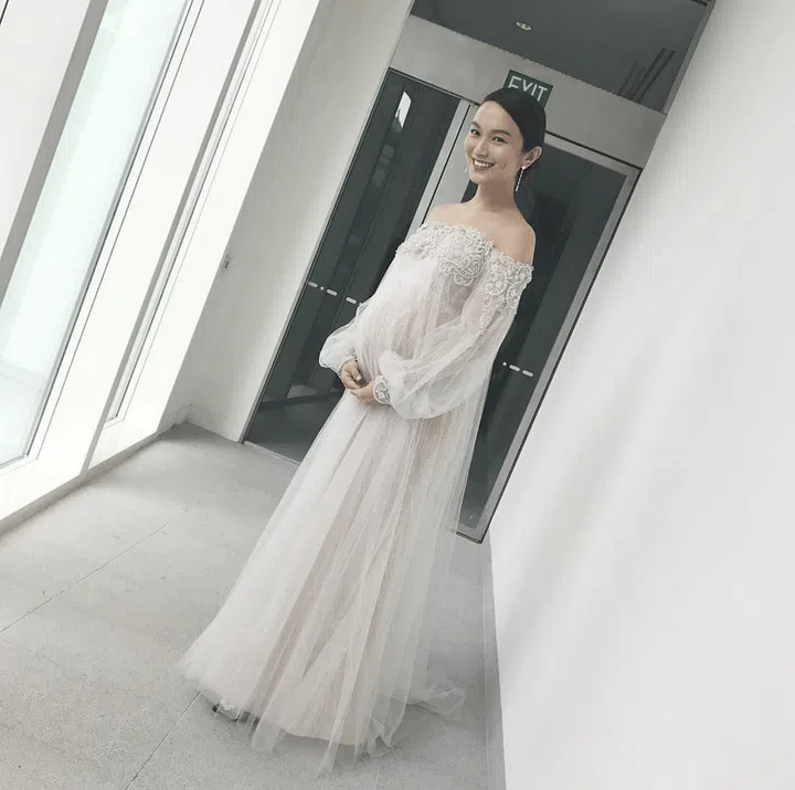 白薇秀虽即将临盆(原本还预录了得奖感言)还挺着大肚出席《红星大奖》, 身上的露肩连衣裙由本地礼服品牌Jessica Cindy量身定制,若影若现的薄纱设计让她散发仙女气质,容光焕发。
