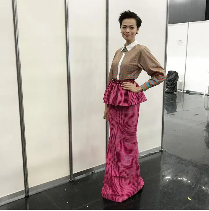 阿姐郑惠玉在一众女星暗黑造型中,以荧光粉红Elsa Schiaparelli高级定制礼服(是新加坡首位穿该品牌的女星)勇夺最佳女主角,几何色块拼接的设计搭配Cartier祖母绿耳坠,既华丽亦不失时尚感。