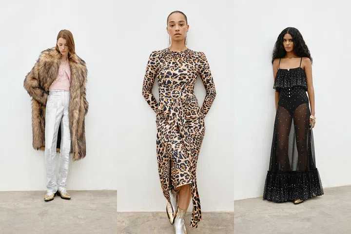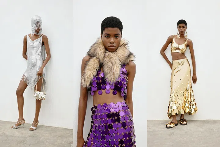 女装系列中,你会发现Rabanne的标志性金属亮片裙装,包括银色、金色和紫色款式,散发着夺目的光彩。此外,还有令人注目的雪纺长裙和豹纹针织连衣裙;前卫的几何图案提花针织两件套装充满活力和激情;刺绣制服夹克展现出华丽的摇滚氛围;毛绒大衣则散发犹如明星一样的霸气风格。