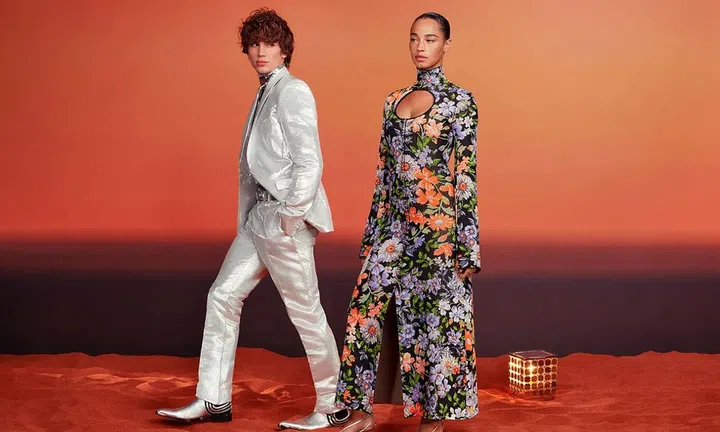 Rabanne H&M系列汲以未来派对为主题,女装设计不仅保留了Rabanne经典的流畅轮廓、华丽配饰和金属光彩,还引入了具有复古风情的提花针织套装,以及高雅贵气的毛绒大衣,为女装注入时尚和优雅感。