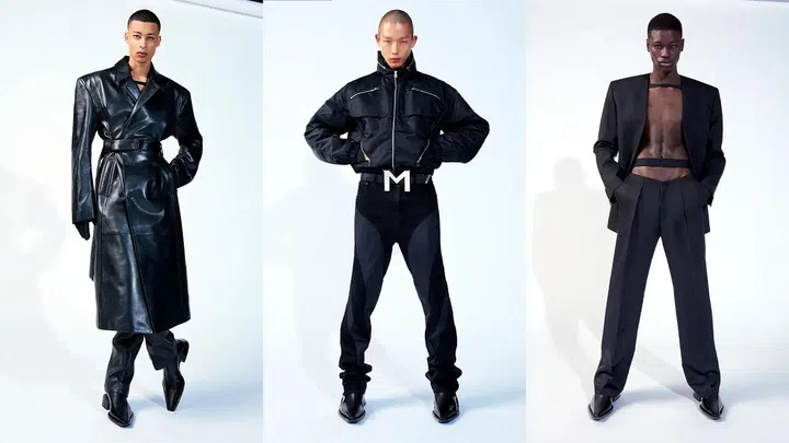 男装单品包括一系列皮革裤、西装外套和带有品牌雕刻钮扣的大衣,牛仔外套具衬垫,放大强调肩部廓形;当然还有可以与之搭配的透肤印花上衣和紧身马甲等前卫单品。而不分性别的配饰,也是此系列的一大焦点,包括网纹手套和紧身裤袜、大肩包和丝巾等;银色和金色的身体链饰以及星形、泪滴形耳环和项链也是 Mugler标志性的热门设计款。
