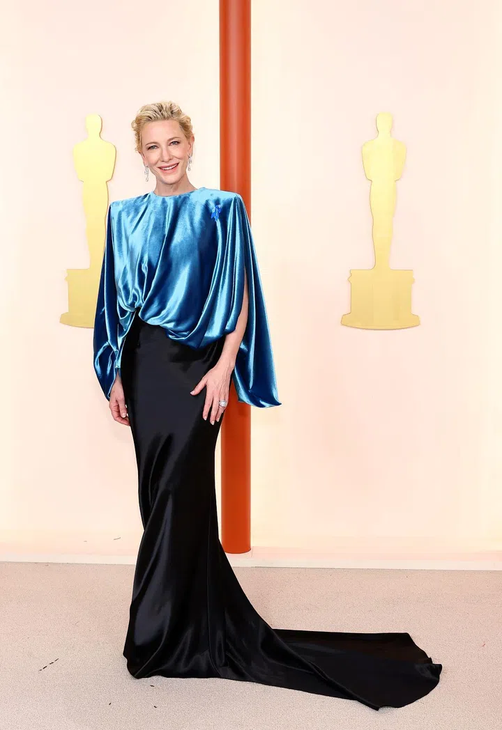 凭《Tar》入围最佳女主角的Cate Blanchett身穿Louis Vuitton定制蓝色垂坠不对称天鹅绒上衣、黑色双缎长裙和黑色高跟鞋出席近年的《奥斯卡》颁奖典礼。这款可持续造型是从未曝光的品牌档案中的一件上衣汲取灵感,半身裙则由可持续的丝绸制作。