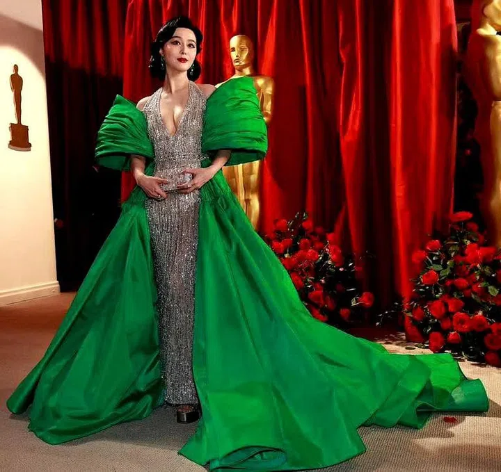 出席2023年《奥斯卡》颁奖典礼的范冰冰选择了Tony Ward定制的银色手工刺绣Charleston礼服,服装以醒目的绿色塔夫绸裙摆和袖子,轻松穿出女神气质。