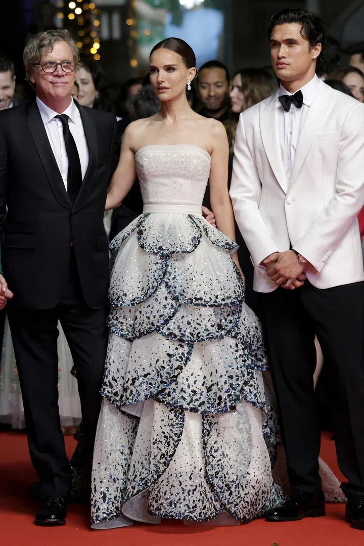 好莱坞影后Natalie Portman在第76届康城影展(Cannes Film Festival 2023)上一连三日身着Dior的服装,以不同的造型展现品牌的多个面向。其中,这一袭Dior礼服是1949年秋冬高级订制系列的复刻版,原版被命名为“Junon”,由 Christian Dior所设计,并被收藏于美国大都会艺术博物馆中。裙摆上绣有虹彩色的亮片与刺绣,走动时犹如孔雀羽毛般熠熠生辉,非常美丽。