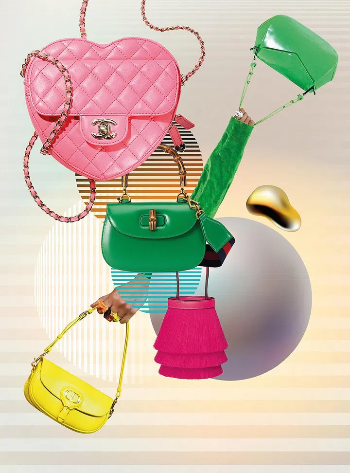 步入2022春夏系列,高级服装与时尚配饰也变得活泼亮丽。各大时尚精品屋以鲜艳梦幻的色调,点缀在标志性的手袋之上。Hermes的的Toupet手袋选用亮色马鬃搭配同色的Swift 小牛皮,充满俏皮风格;极具少女情怀的Chanel心形手袋以标志性菱格纹绗缝皮革打造;Dior今季手袋系列仿佛浸染于糖果调色盘,五彩缤纷;Bottega Veneta也推出多款亮色新包;Gucci以梦幻配色呈现Gucci Bamboo1947系列。