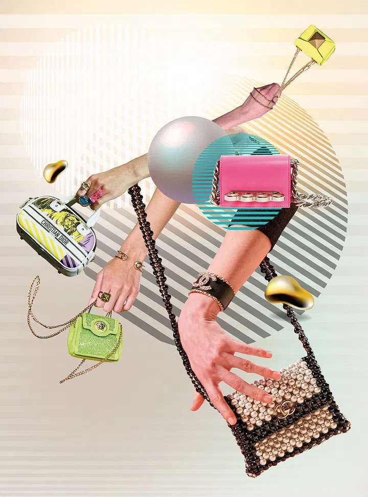 与超大号手袋形成强烈的视觉反差,今年春夏依然流行小巧精致的迷你手袋,除了有适合晚宴的小包,品牌也为经典包款推出袖珍款式,为造型增添画龙点睛的效果。Dior今季为超小迷你包系列增添新款式和颜色,其中包括Vibe Zip Bowling手袋;Versace的超迷你手袋渲染着春夏气息;Valentino的迷你手袋点缀着品牌标志性的铆钉元素;Alexander McQueen为Four Rings系列推出袖珍版款式;手掌般大小的Chanel珍珠手袋俏皮迷人。