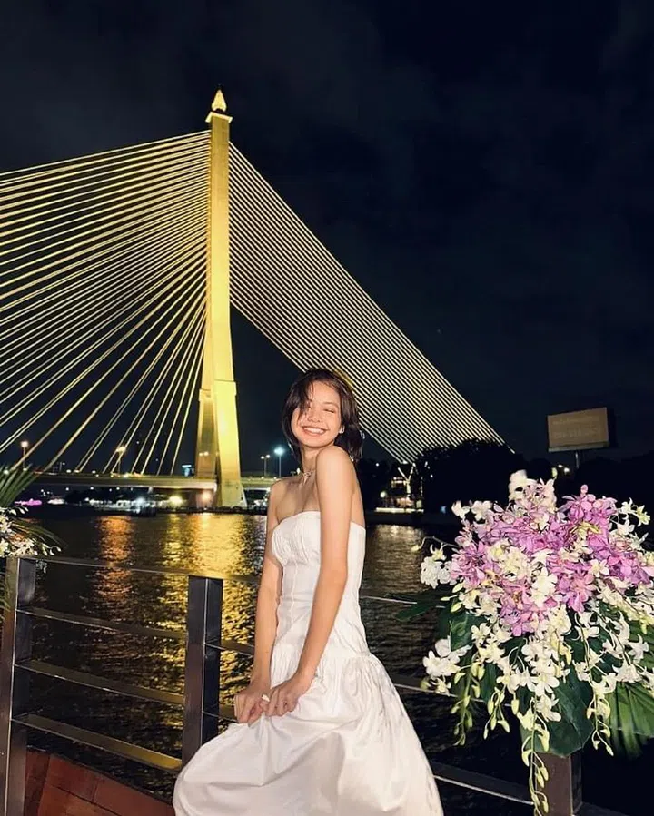 Lisa的形象向来多变,舞台上性感火辣,但清新温柔的风格也难不倒她。Lisa身穿的白色平口连身裙来自设计师品牌Tove,上身呈紧身胸衣样式,设有缩褶罩杯,腰身贴合身形曲线,裙摆则是宽松剪裁,展现恬静温柔的气质,再配搭Bvlgari的B.Zero1镶钻玫瑰金项链,为造型增添精致细节。