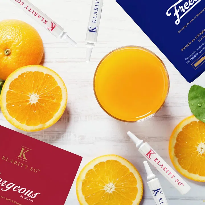 本地美容品牌Klarity SG 近日推出口服性胶原蛋白安瓶,其中 Gorgeous™ by Klarity 主要针对肌肤保养,它含有玻尿酸、维他命C和谷胱甘肽,协助提升肌肤的滋润、延缓细纹和皱纹生成。早晨时可把它加入果汁里饮用,非常便捷。