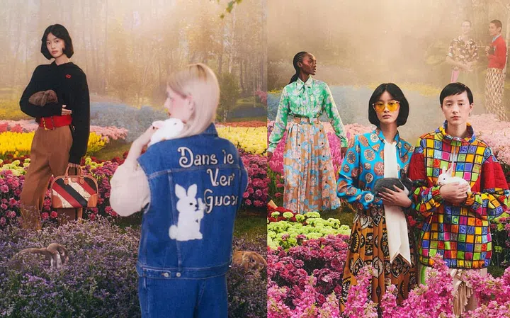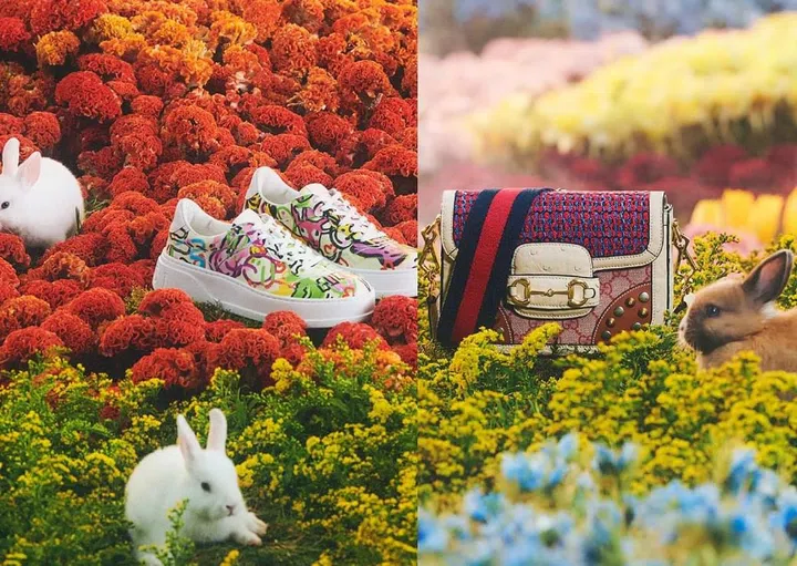 Gucci 兔年系列商品呈现三大主题风格:运用大量色块撞色拼接的“普普风”、色彩缤纷的“涂鸦风”,以及优雅知性的“花卉风”。而最重要的兔子意象,以编织或刺绣的手法巧妙幻化成不同各款成衣,或以独特的喷漆风格呈现于T恤、皮革休闲鞋和手表之上。鞋履方面,亦善用兔耳朵造型蝴蝶结、抓毛元素呈现,洋溢农历新年的快乐气息。