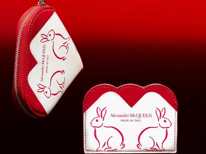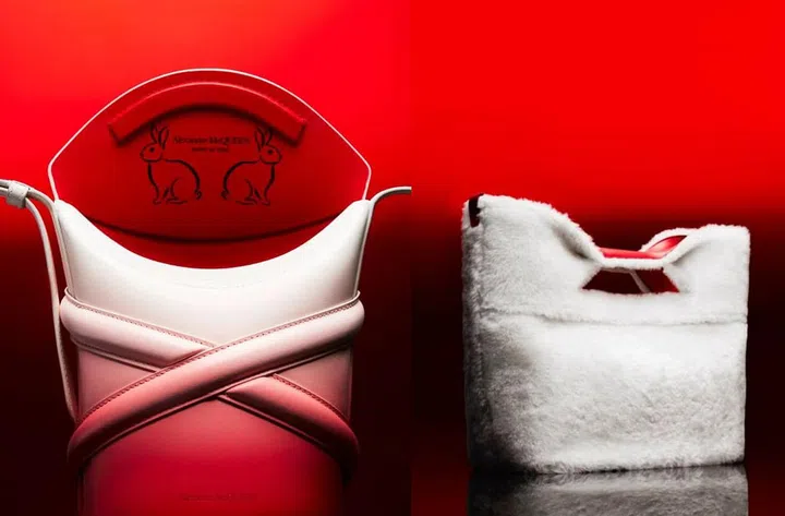 Alexander McQueen农历新年系列主要以象征好运的红色结合柔象牙色,推出The Curve和The Bow手袋等多款经典作品的独家款式,选用精致皮革和长毛羊皮制作,除了备有不同尺寸,部分更呈现渐变效果,设计丰富多样。为呼应2023兔年,双兔图案贯穿整个系列,其灵感源自McQueen伦敦工作室特别设计的艺术图案。