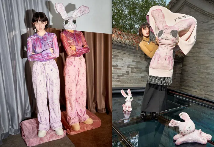 随着兔年的临近,Acne Studios 与艺术家 Apollinaria Broche 联手合打造一个充满欢乐的农历新年胶囊系列。俄籍法裔艺术家 Apollinaria Broche以将陶瓷雕塑作为一种有趣的工艺而闻名,此次的联名系列包括了家居用品、珠宝和一系列雕塑。主角BUN BUN以珐琅形式出现在项链和耳环之上;或是印刷在装饰在柔和的粉色针织毯子;Acne Studios与Broche也推一系列限量版珐琅雕塑,展示了各种场景和情绪的可爱兔子。Acne Studios特别邀请金马奖最佳女主角文淇演绎,她身着品牌2023春夏系列衣装,与BUN BUN在中国北京拍摄农历新年系列的形象广告。